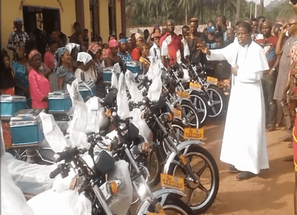 During Fr. Pascal’s trip NVE purchased motorcycles and initiated 8 motorcycle businesses in Alamaku. This was a microloan initiative and the village residents who were selected for this initiative are required to pay back 50% of the cost from the money they earn from their newly established businesses. Below you can see a picture of Fr. Pascal as he is about to bless the Motorcycles before they are put into service.