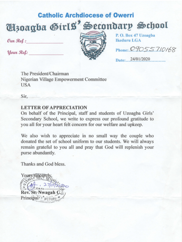 Below is a picture of the students and staff in their new uniforms. Next to it is a copy of the thank you letter we received.
